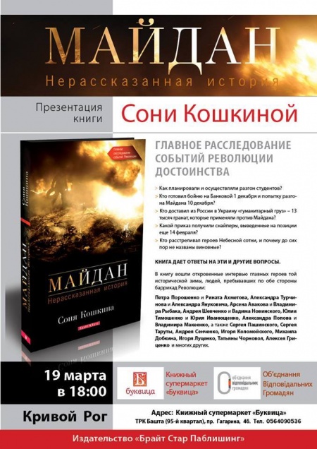 На эти и все другие актуальные, болезненные и серьезные вопросы отвечает Соня Кошкина, автор главного журналистского расследования Революции Достоинства «Майдан. Нерассказанная история». Презентация книги, а также автограф-сессия состоится при поддержкеОб’єднанняВідповідальних Громадян в книжном супермаркете «Буквица» (95 квартал, ТРК «Башня», пр. Гагарина, 46) в четверг, 19 марта, в 18:00. Вход свободный. За дополнительной информацией обращайтесь по телефону 096-555-12-95 (Ольга, пресс-секретарьОб’єднанняВідповідальних Громадян).