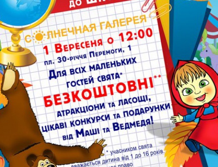 1 Сентября приходи в ТРК "Солнечная Галерея" и развлекайся с Машей и Медведем в настоящем парке аттракционов! Помоги Медведю собрать Машу в школу! Прими участие в конкурсах и получи билет в настоящий Парк Развлечений! Для самых маленьких посетителей праздника* бесплатные** аттракционы и сладости, Интересные конкурсы и подарки от Маши и Медведя! *участником праздника считается ребенок от 1 до 16 лет. Один ребенок имеет право использовать 1 флаер. |