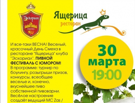 И все-таки ВЕСНА! Веселый, красочный День Смеха в ресторане Ящерица СРК Эскориал. В программе: турнир по боулингу, розыгрыши призов, конкурсы, всеобщее веселье и, конечно, вкуснейшее пиво собственной пивоварни. Весёлое настроение создаёт ведущий MC Zaz/Игорь Засельский. Живая музыка от группы Evergreen Dand/